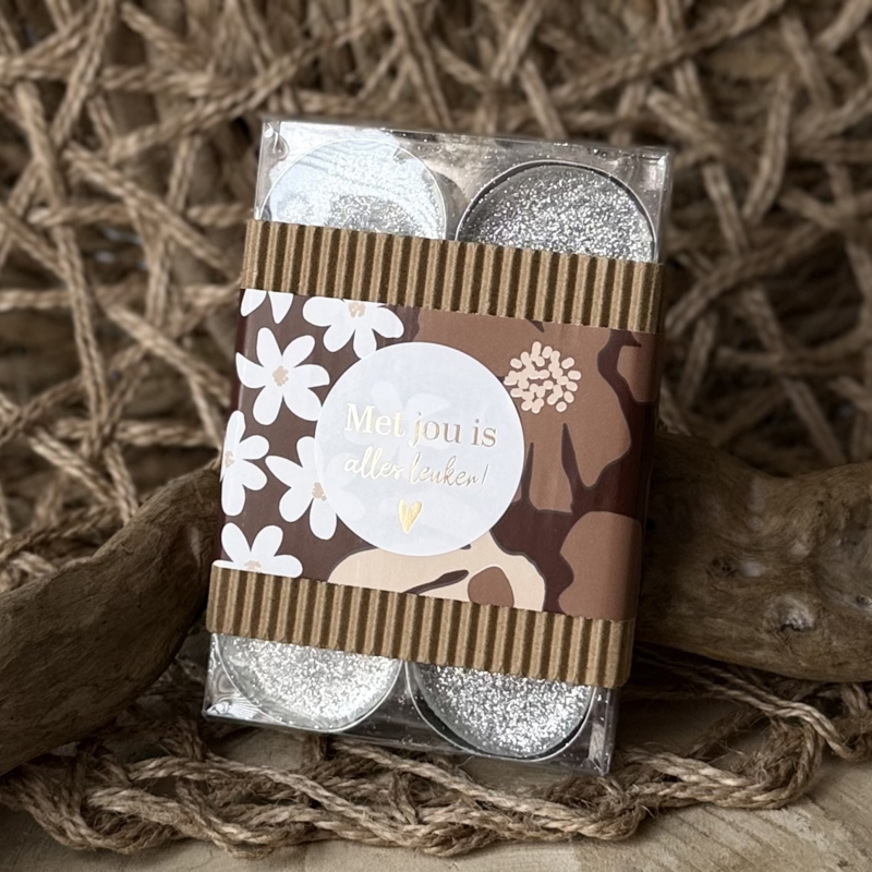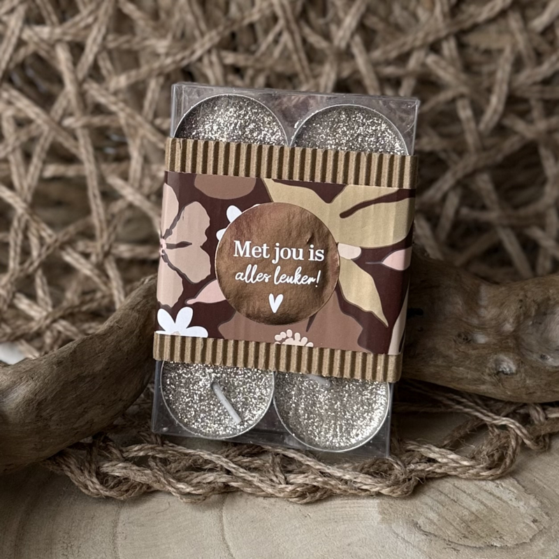 Deze waxinelichtjes zijn zo leuk om kado te geven. Er zitten 6 waxinelichtjes met glitters in een hard plastic verpakking.