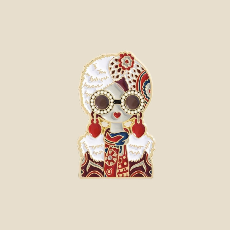Deze speelse pin toont een elegante dame met een opvallende outfit, grote ronde zonnebril en prachtige accenten. De combinatie van goudkleurige details, warme kleuren en verfijnde patronen zorgt voor een luxe en artistieke uitstraling.