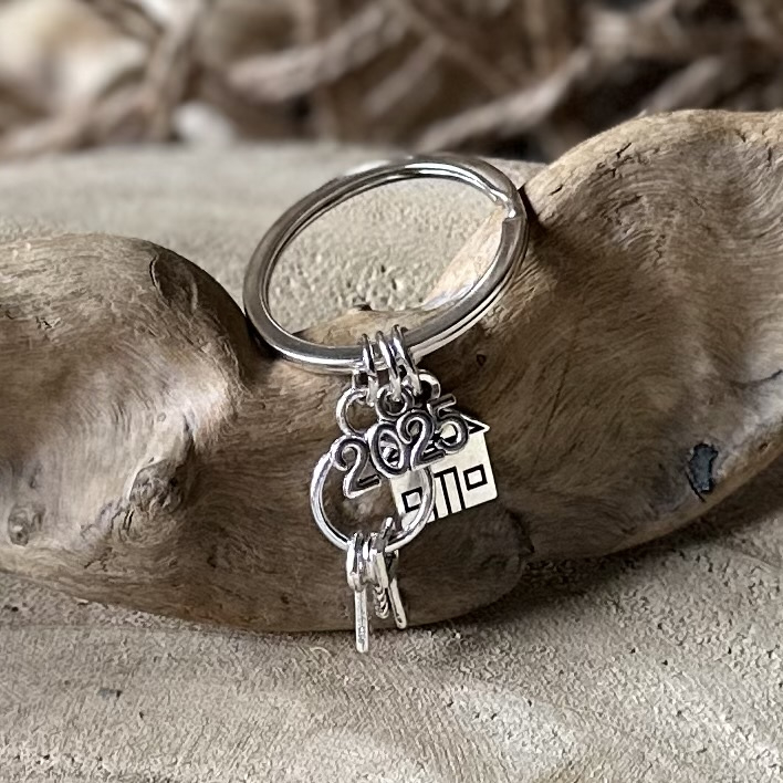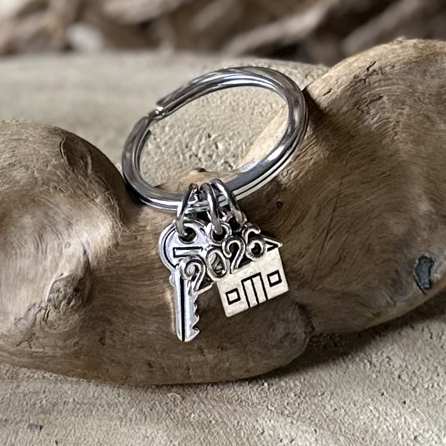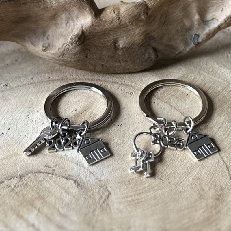 Sleutelhanger met Metalen huisje, sleutels en het jaartal 2025 of 2026